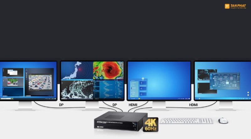 - Quad-Display 4K@60Hz – không gian vận hành mở rộng: ATEN KE8980MR hỗ trợ xuất hình đồng thời lên 4 màn hình độc lập (2 HDMI, 2 DisplayPort) với độ phân giải lên đến 4096 × 2160 @ 60Hz, mang lại hình ảnh sắc nét, chi tiết và mượt mà.